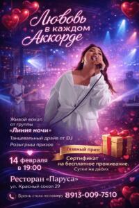 Любовь в каждом аккорде: 14 февраля в ресторане «Паруса» У нас розыгрыш подарков для влюбленных. Главный приз - бесплатное проживание в санатории на двоих