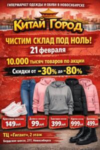 Бердск, а вы уже слышали? Гипермаркет одежды и обуви «Китай Город» в ТЦ «Гигант» чистит склад под ноль С 21 февраля распродажа со скидками до 80%