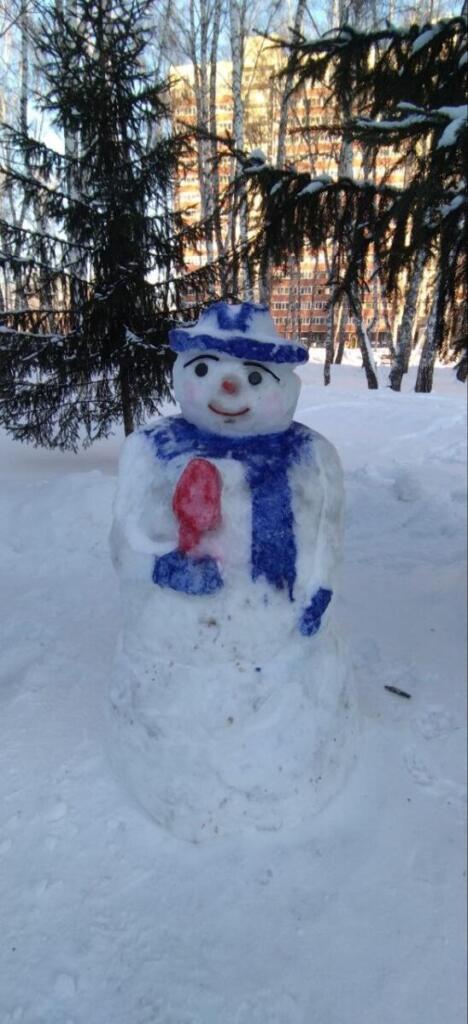 Радует горожан 63-летний Виктор Мелешев. Главный герой композиции - Снеговик. Новогодняя инсталляция из снега расположилась во дворе дома Лунная, 8