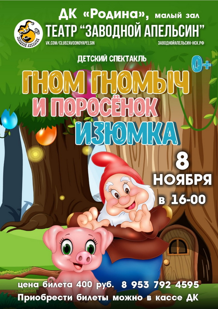 8 ноября ДК «Родина» приглашает на спектакль «Гном Гномыч и поросёнок Изюмка»