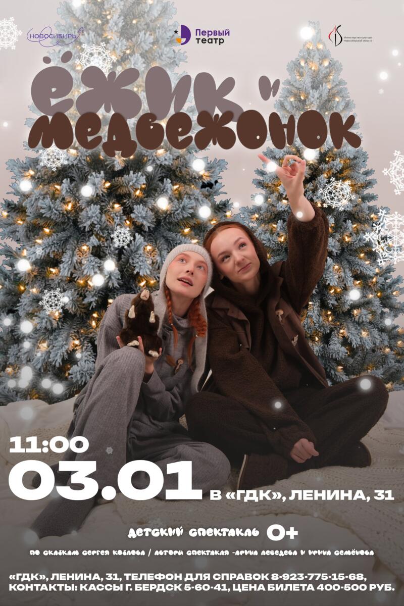 В субботу, 3 января, в 11:00 в большом зале ГДК Бердска состоится спектакль для детей «Ёжик и Медвежонок» театра «Первый театр».