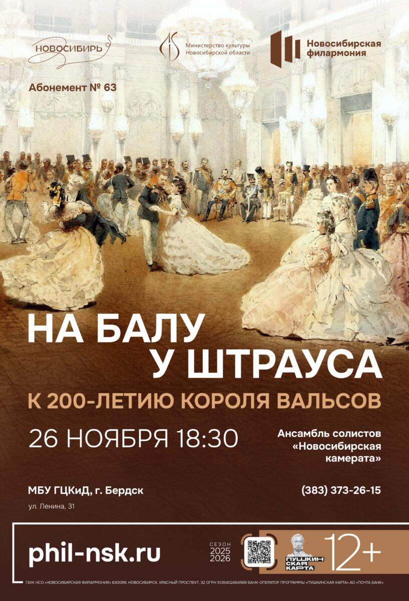 В среду, 26 ноября, в 18:30 в большом зале ГДК Бердска состоится концерт «На балу у Штрауса» Новосибирской государственной филармонии.