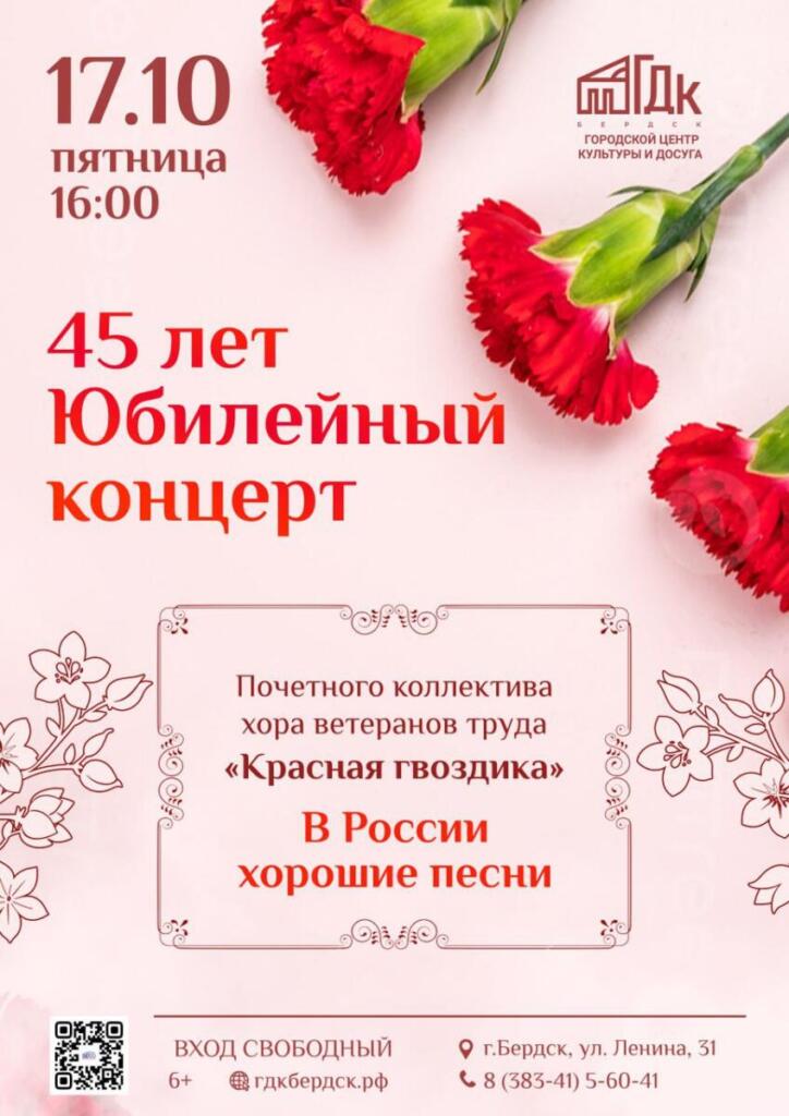 В пятницу, 17 октября, в 16:00 в большом зале ГДК Бердска состоится концерт «В России хорошие песни» Почетного коллектива хора ветеранов труда «Красная гвоздика» в честь 45-летнего юбилея.