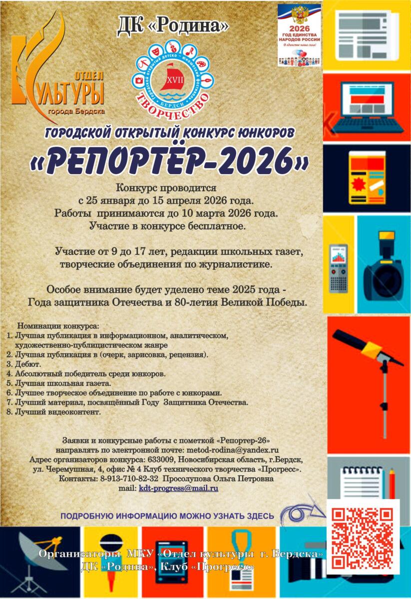 Открыт прием заявок на Городской открытый конкурс юнкоров «Репортёр 2026». Конкурс проходит в рамках XVII городского открытого детско-юношеского фестиваля «Творчество».