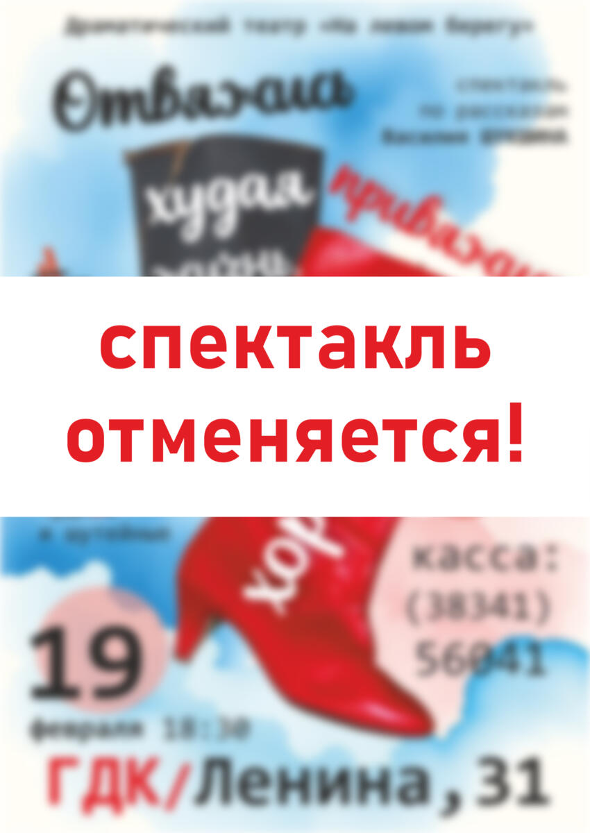 Информируем о том, что спектакли «Отвяжись худая жизнь, привяжись хорошая», «Муха-Цокотуха», «Путешествие в Чукоккалу», запланированные в Бердске на площадке ул. Ленина, 31 (ГДК), отменяются.