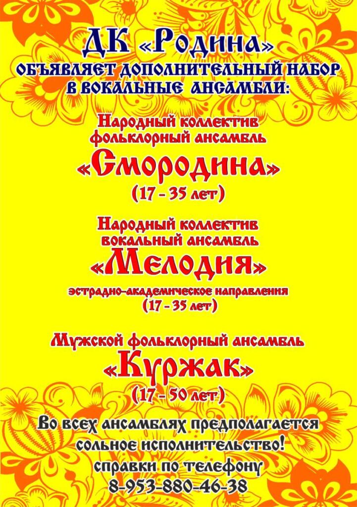 ДК «Родина» объявляет дополнительный набор в вокальные ансамбли