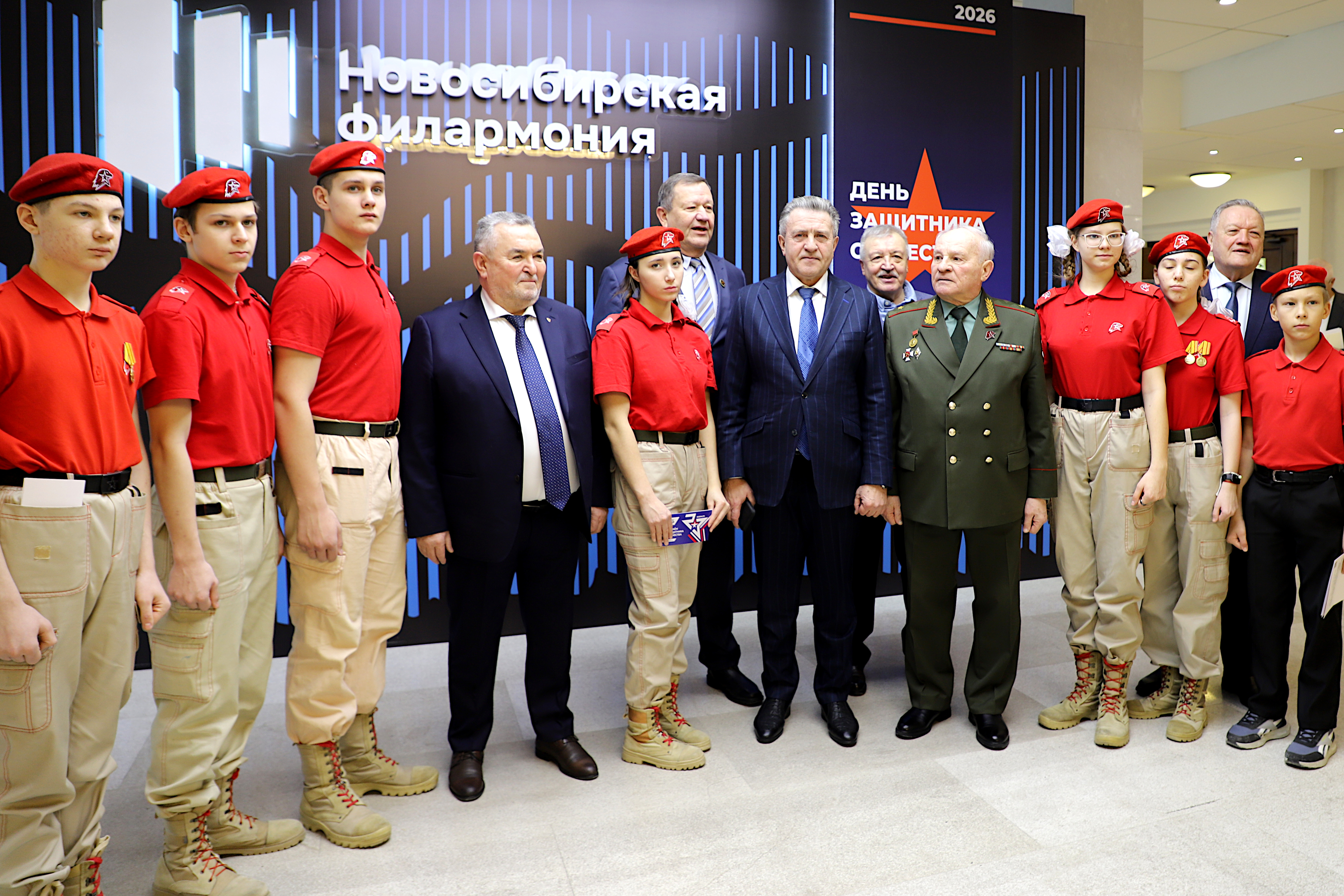 На торжественное собрание «Отчизна гордится вами» в концертном зале имени А.М. Каца собрались все, кто с гордостью носит звание защитника Отечества, и юнармейцы, курсанты, которые чувствуют свою сопричастность большому государственному празднику. На первых рядах – участники специальной военной операции, участники проекта Законодательного Собрания Новосибирской области «В одной команде со СВОими», многие пришли со своими семьями, женами и детьми. В фойе были открыты выставки «Защитники Отечества», «СВОи Герои». Пролог «Гимн Родине» в исполнении военного оркестра штаба Сибирского ордена Жукова округа войск национальной гвардии РФ и ансамбля песни и танца «Чалдоны» открыл праздничную программу.