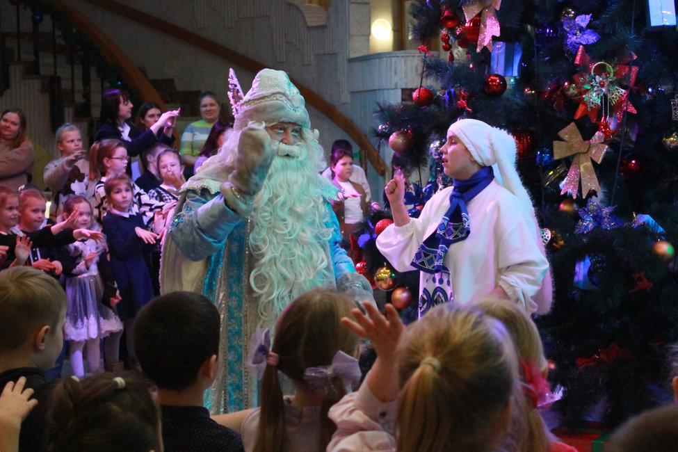 Перед началом представления дети встретились с Дедушкой Морозом, водили хороводы вокруг большой, красивой ели, играли с аниматорами в подвижные игры и отгадывали новогодние загадки.