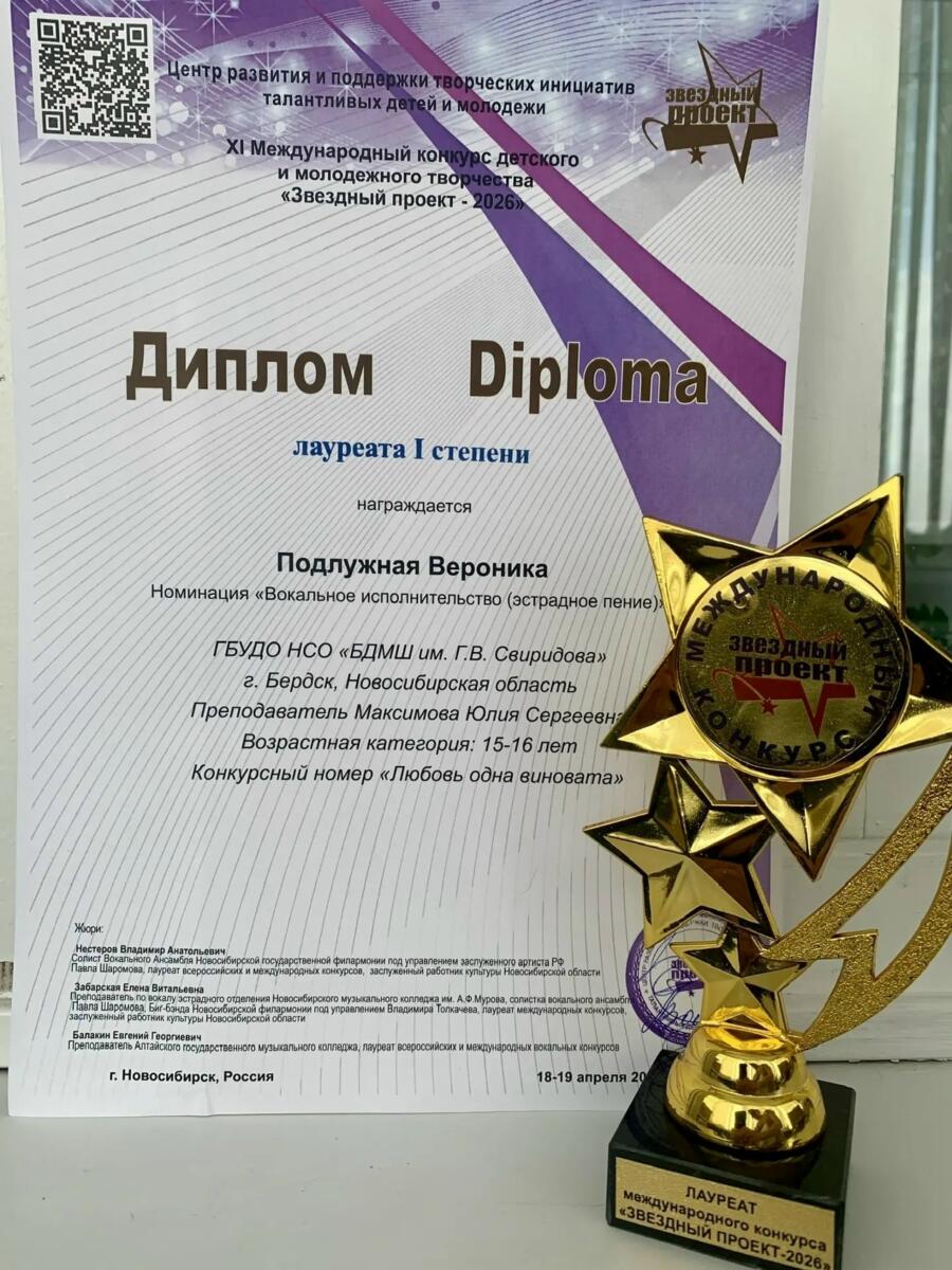 Ученица БДМШ им. Г.В. Свиридова Вероника Подлужная достойно представила эстрадно-джазовое отделение. Вероника была единственной солисткой от бердской школы. С песней композитора А. Зацепина на стихи Л. Дербенева «Любовь одна виновата» бердчанка покорила жюри и завоевала диплом лауреата I степени и кубок. За этим успехом — талант, труд и поддержка замечательного педагога Юлии Сергеевны Максимовой.