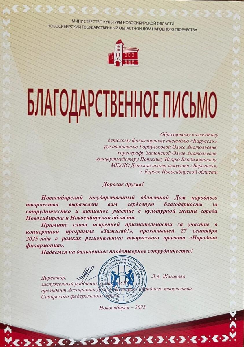 На сцену вышли артисты из Бердска — Образцовый коллектив детский фольклорный ансамбль «Карусель» ДШИ «Берегиня» и образцовый хореографический ансамбль «Арабески» МАУ «Дворец культуры «Родина».