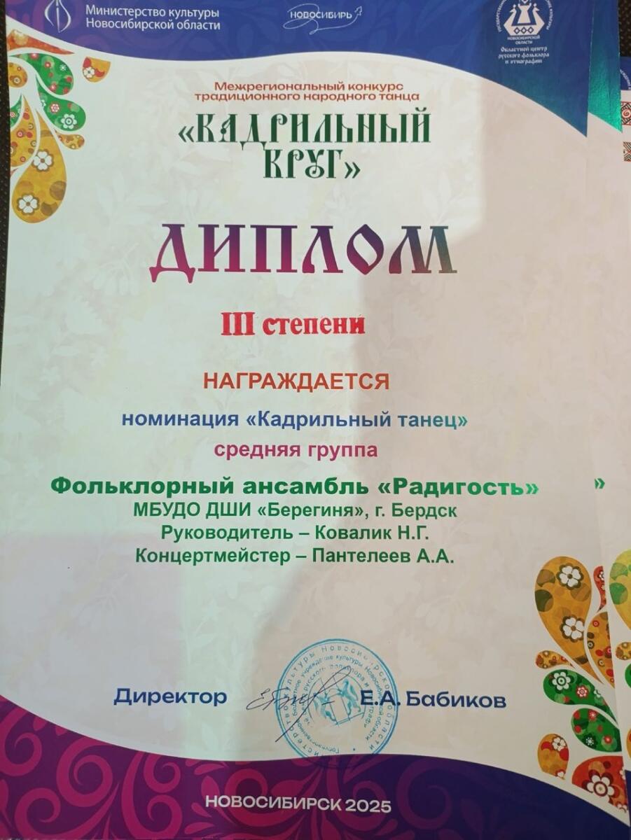 Дипломантами II и III степеней на Межрегиональном конкурсе традиционного народного танца «Кадрильный круг» стал фольклорный ансамбль «Радигость» ДШИ «Берегиня».