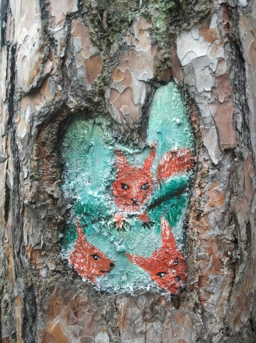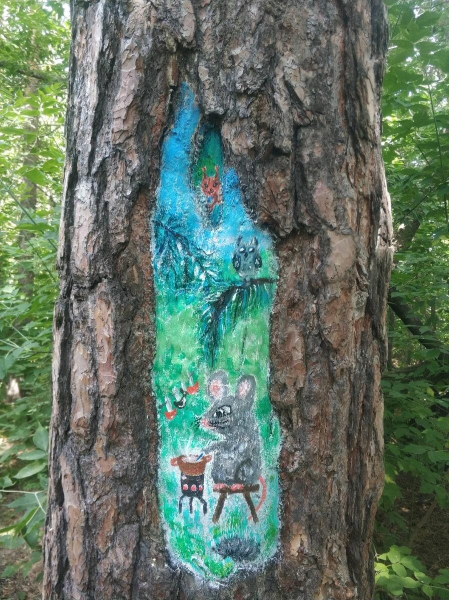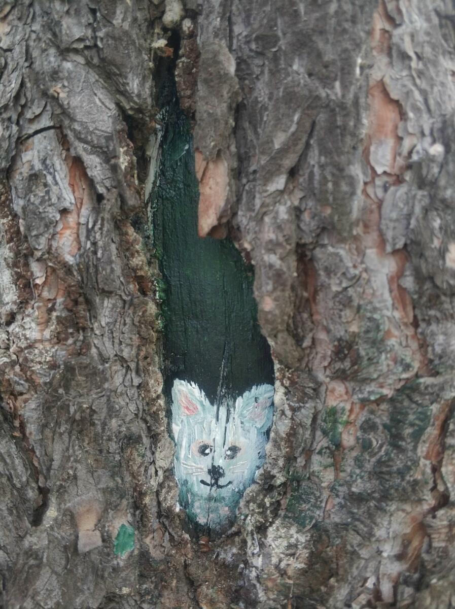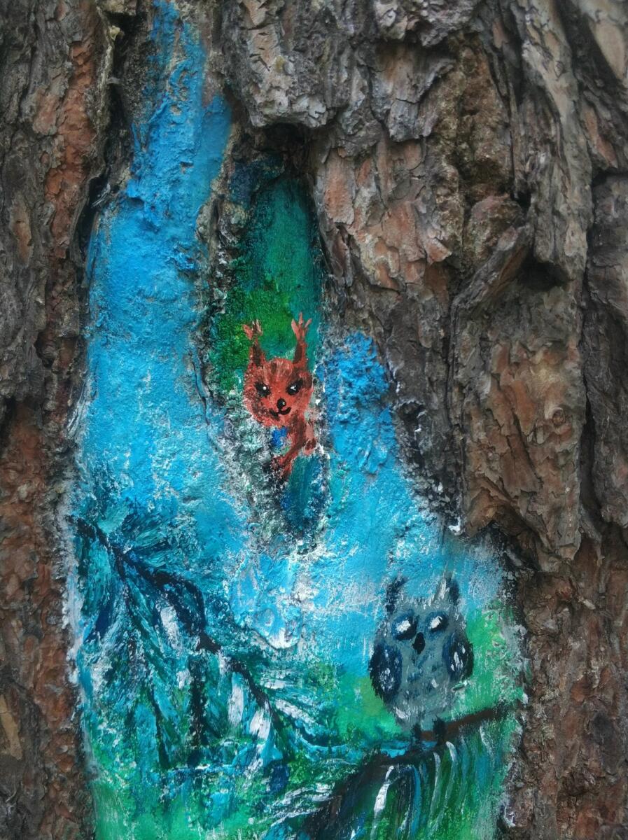 Места для рисунков находятся сами. Это деревья вдоль прогулочных тропинок. Но некоторые рисунки и поискать придётся. Акриловые краски хорошо сохраняют цвет, и как выяснилось, суровую зиму. Страдают только от вандалов. Приходилось несколько раз подрисовывать. Ну, и белки коготками царапают. Это не страшно, мы же не в музее, — продолжает собеседница.