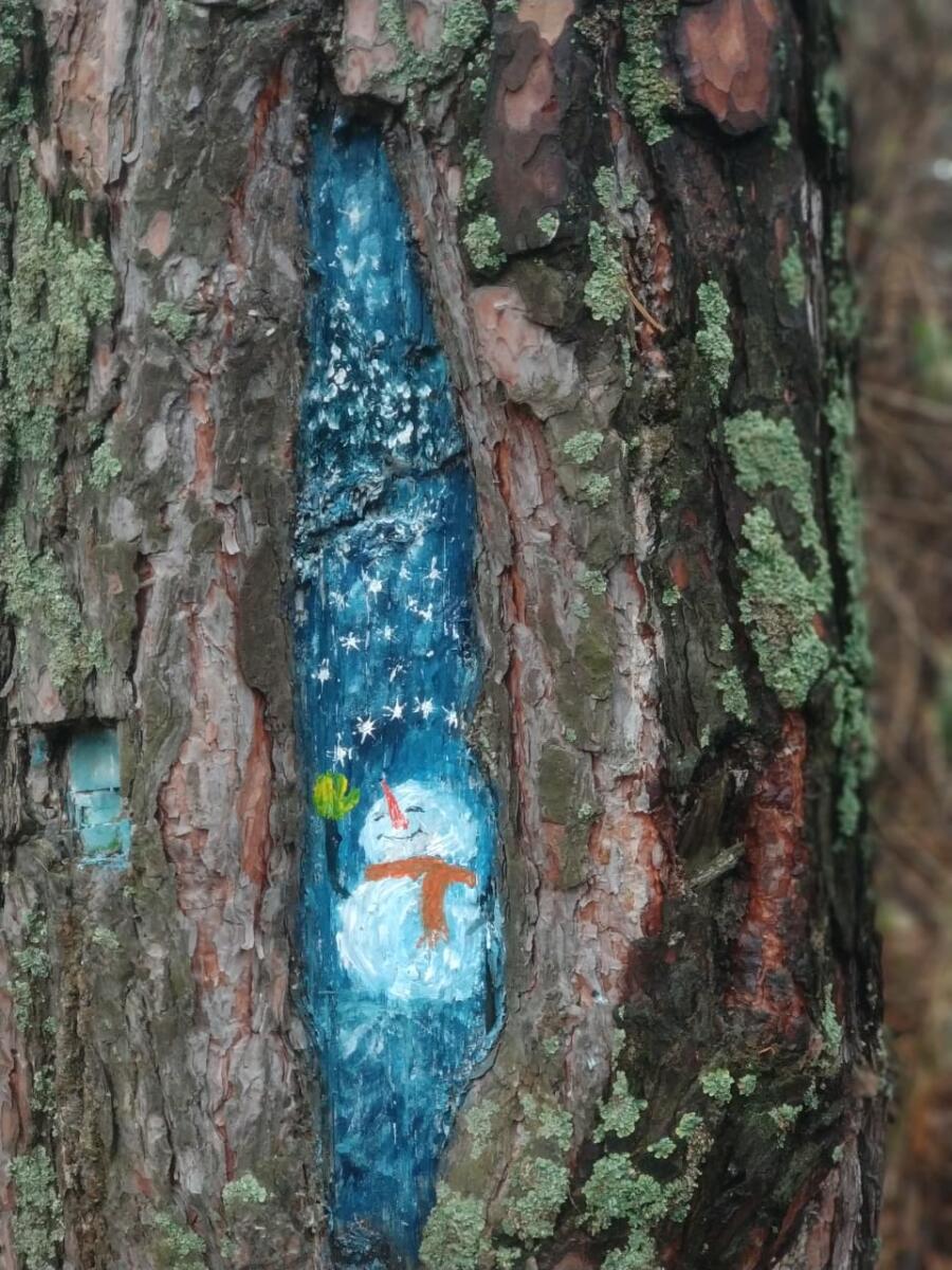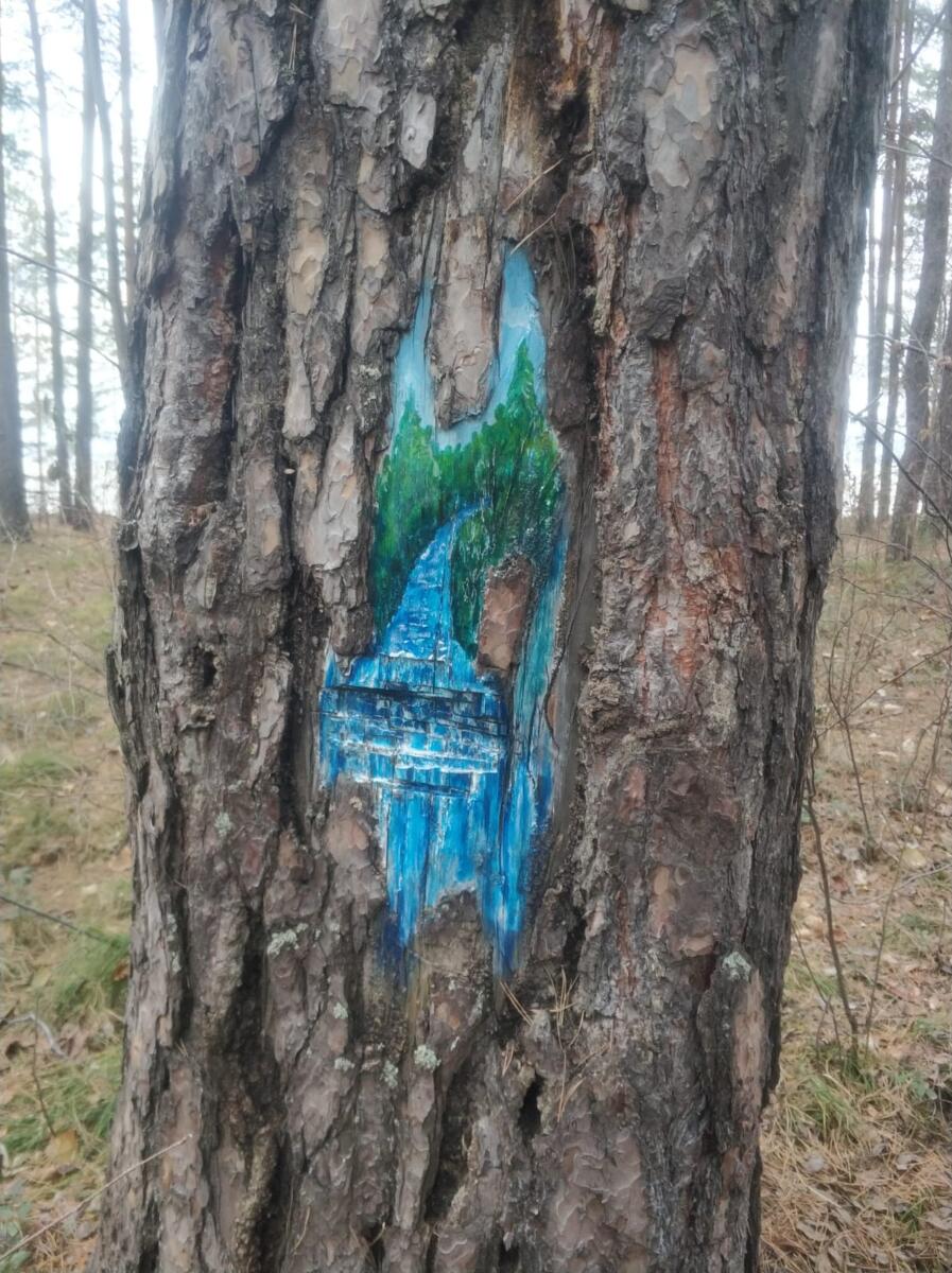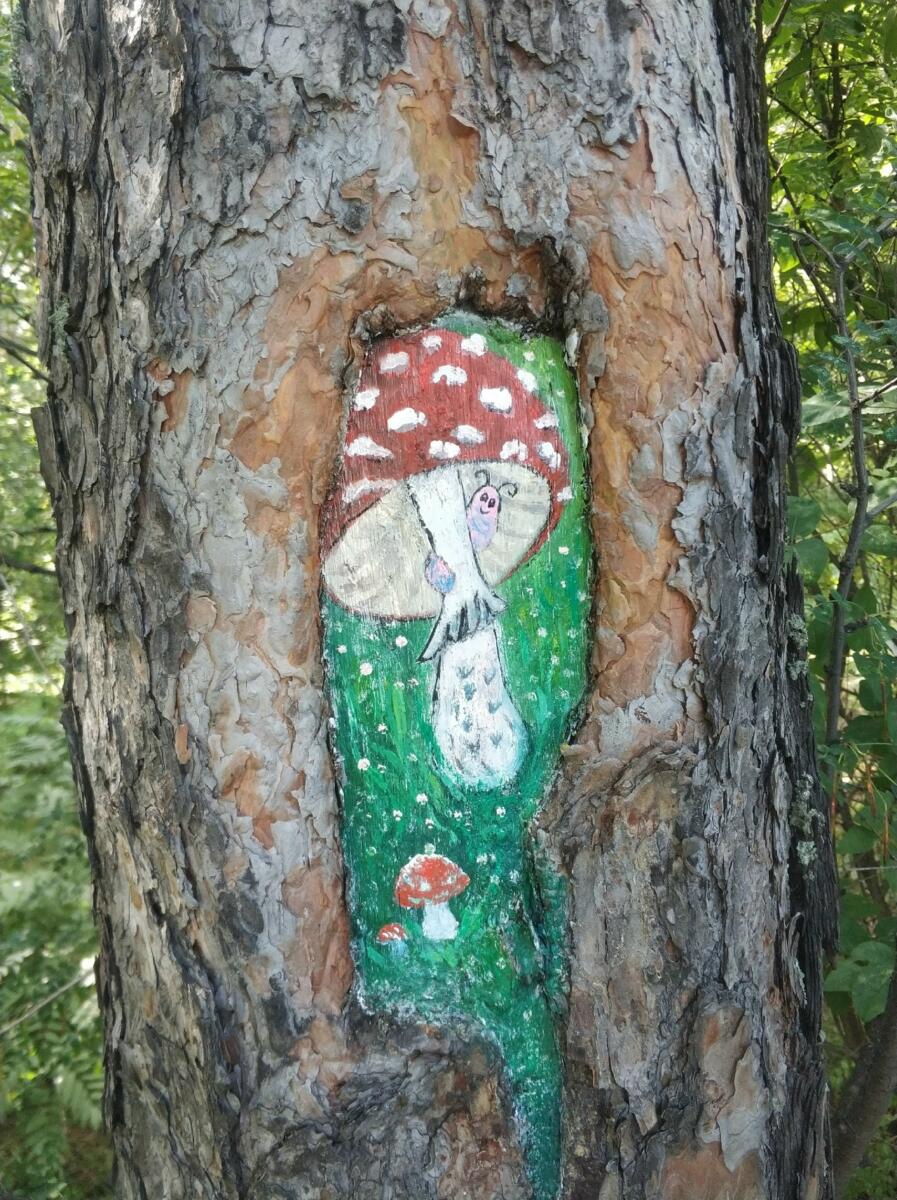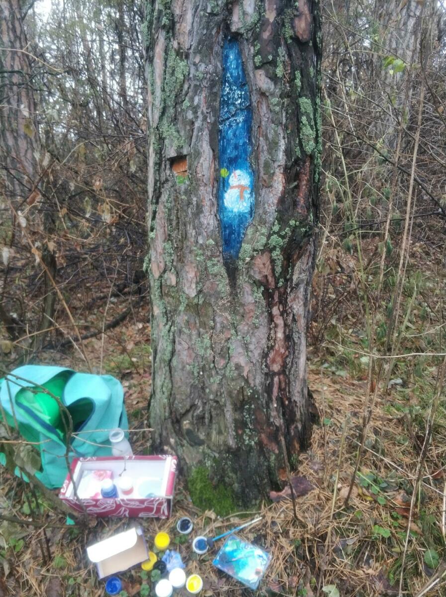 Места для рисунков находятся сами. Это деревья вдоль прогулочных тропинок. Но некоторые рисунки и поискать придётся. Акриловые краски хорошо сохраняют цвет, и как выяснилось, суровую зиму. Страдают только от вандалов. Приходилось несколько раз подрисовывать. Ну, и белки коготками царапают. Это не страшно, мы же не в музее, — продолжает собеседница.