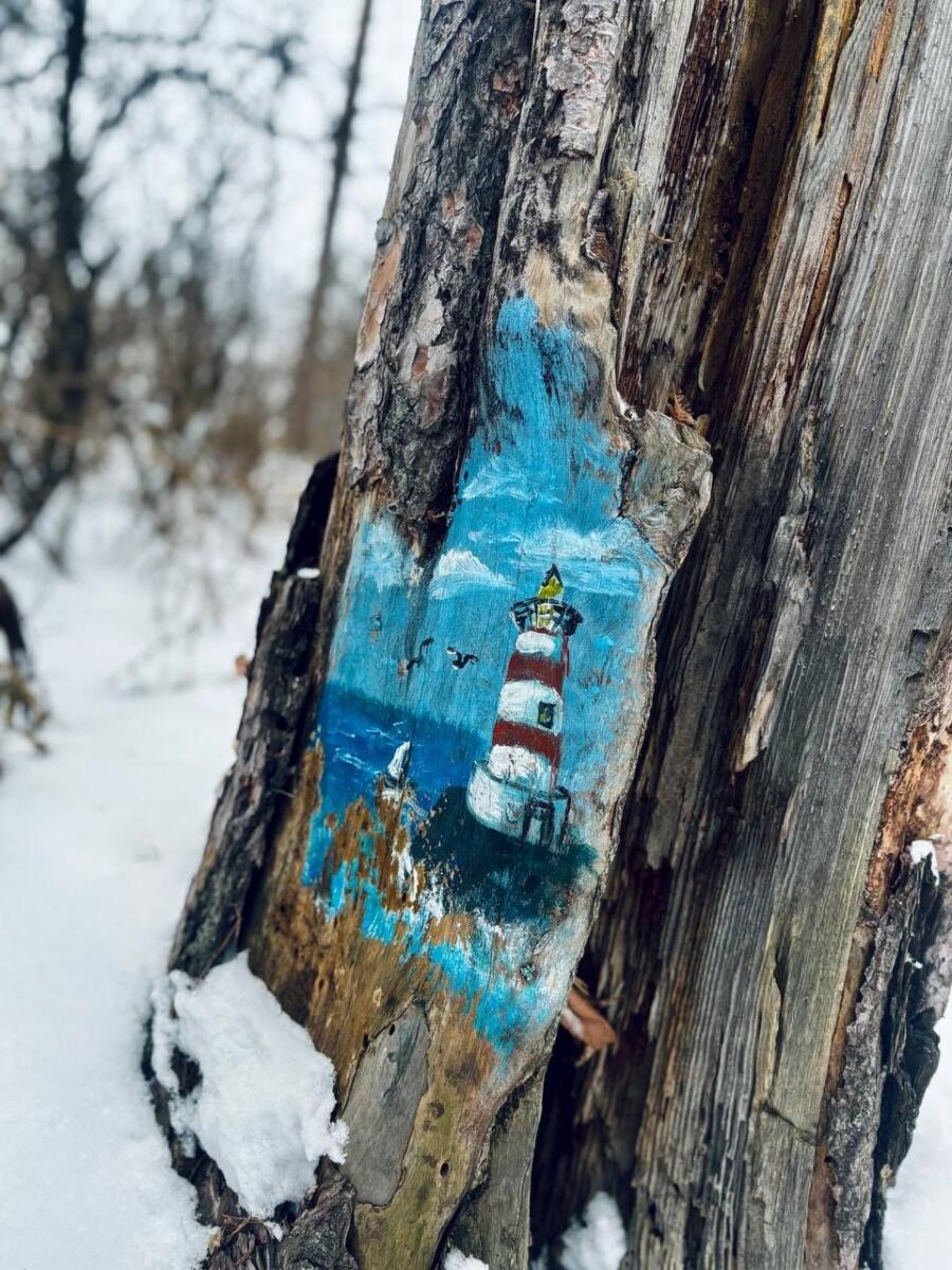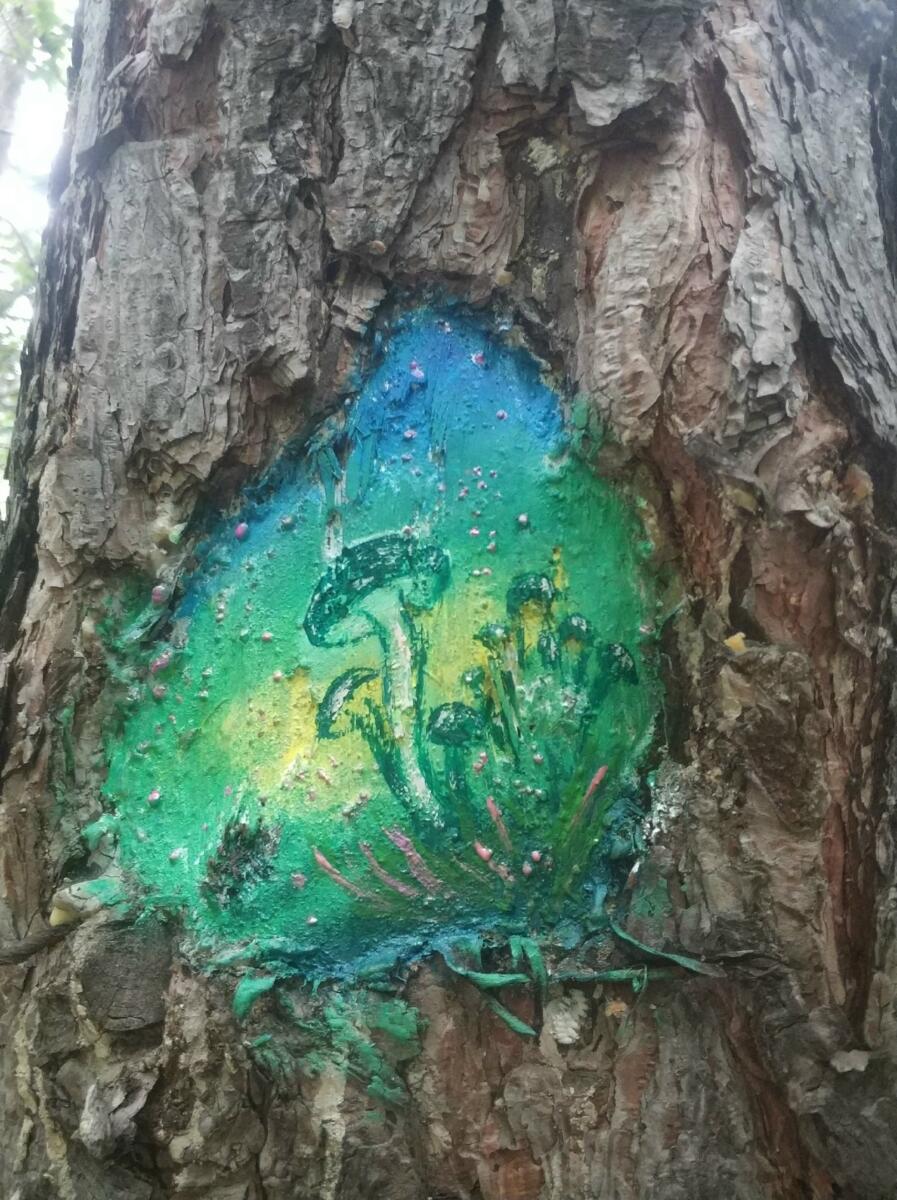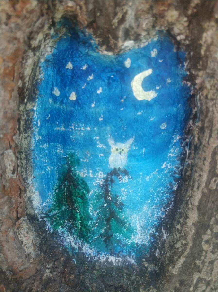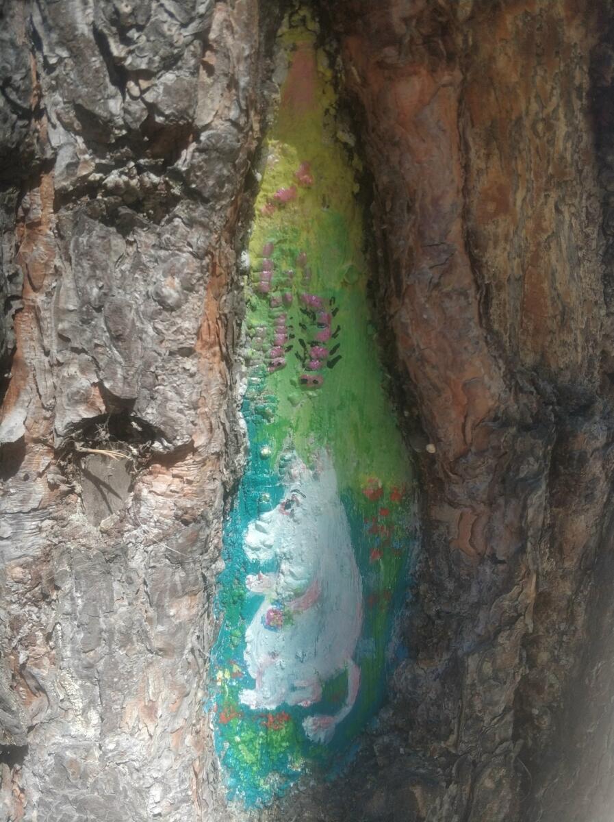 Места для рисунков находятся сами. Это деревья вдоль прогулочных тропинок. Но некоторые рисунки и поискать придётся. Акриловые краски хорошо сохраняют цвет, и как выяснилось, суровую зиму. Страдают только от вандалов. Приходилось несколько раз подрисовывать. Ну, и белки коготками царапают. Это не страшно, мы же не в музее, — продолжает собеседница.