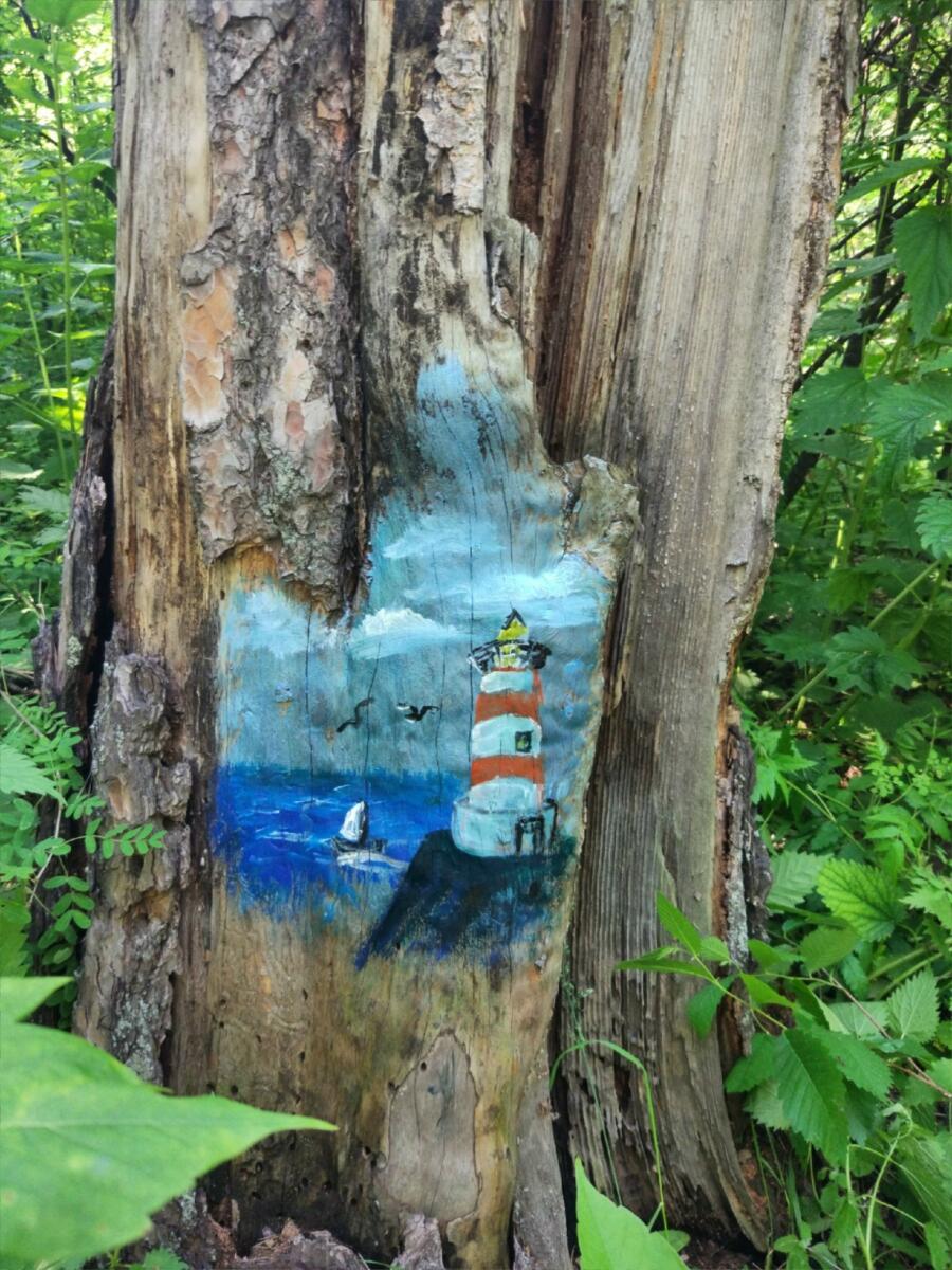 Места для рисунков находятся сами. Это деревья вдоль прогулочных тропинок. Но некоторые рисунки и поискать придётся. Акриловые краски хорошо сохраняют цвет, и как выяснилось, суровую зиму. Страдают только от вандалов. Приходилось несколько раз подрисовывать. Ну, и белки коготками царапают. Это не страшно, мы же не в музее, — продолжает собеседница.