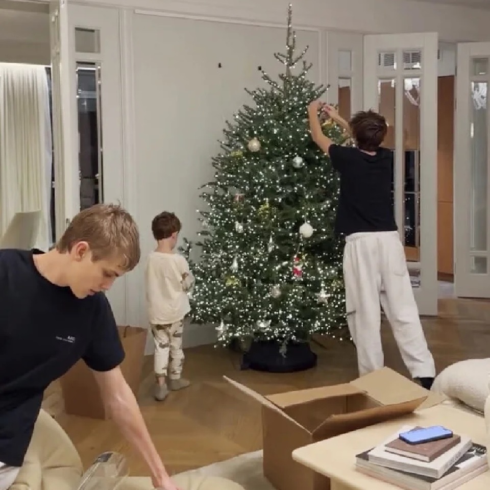 Елена Перминова вместе со своими детьми украсила ель в их новом доме. Они предпочли живое дерево, которое было усыпано гирляндой и разнообразными игрушками.