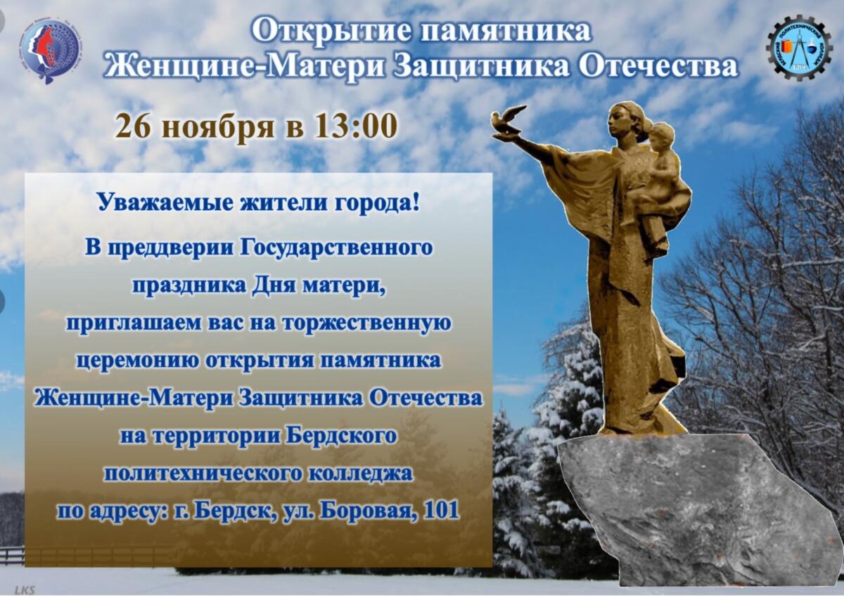 Коллектив Бердского политехнического колледжа приглашает на открытие обелиска женщине-матери. Мероприятие состоится 26 ноября в 13.00.
