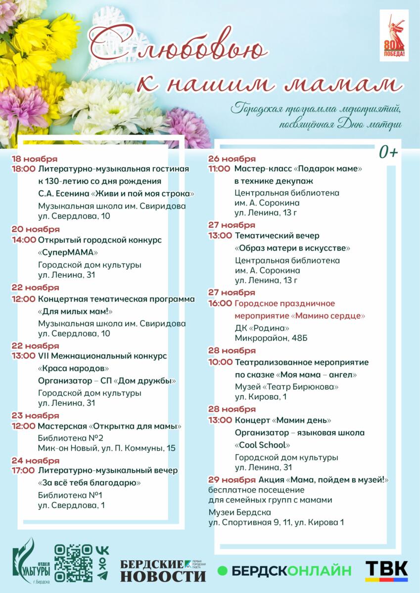 Бердский отел культуры сообщил программу мероприятий, посвященных Дню матери. Прекрасный праздник отмечается в этом году 30 ноября.