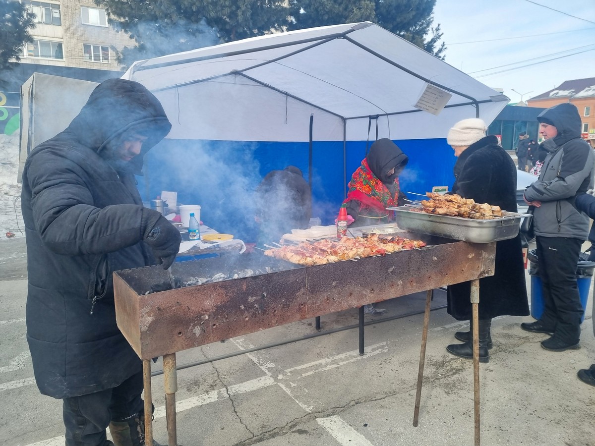 Жители покупают шашлыки, пьют горячий чай. Играют, развлекаются, охотно фотографируются. Повязывают ленточки на счастье и на здоровье. Гуляют все в день широкой Масленицы!