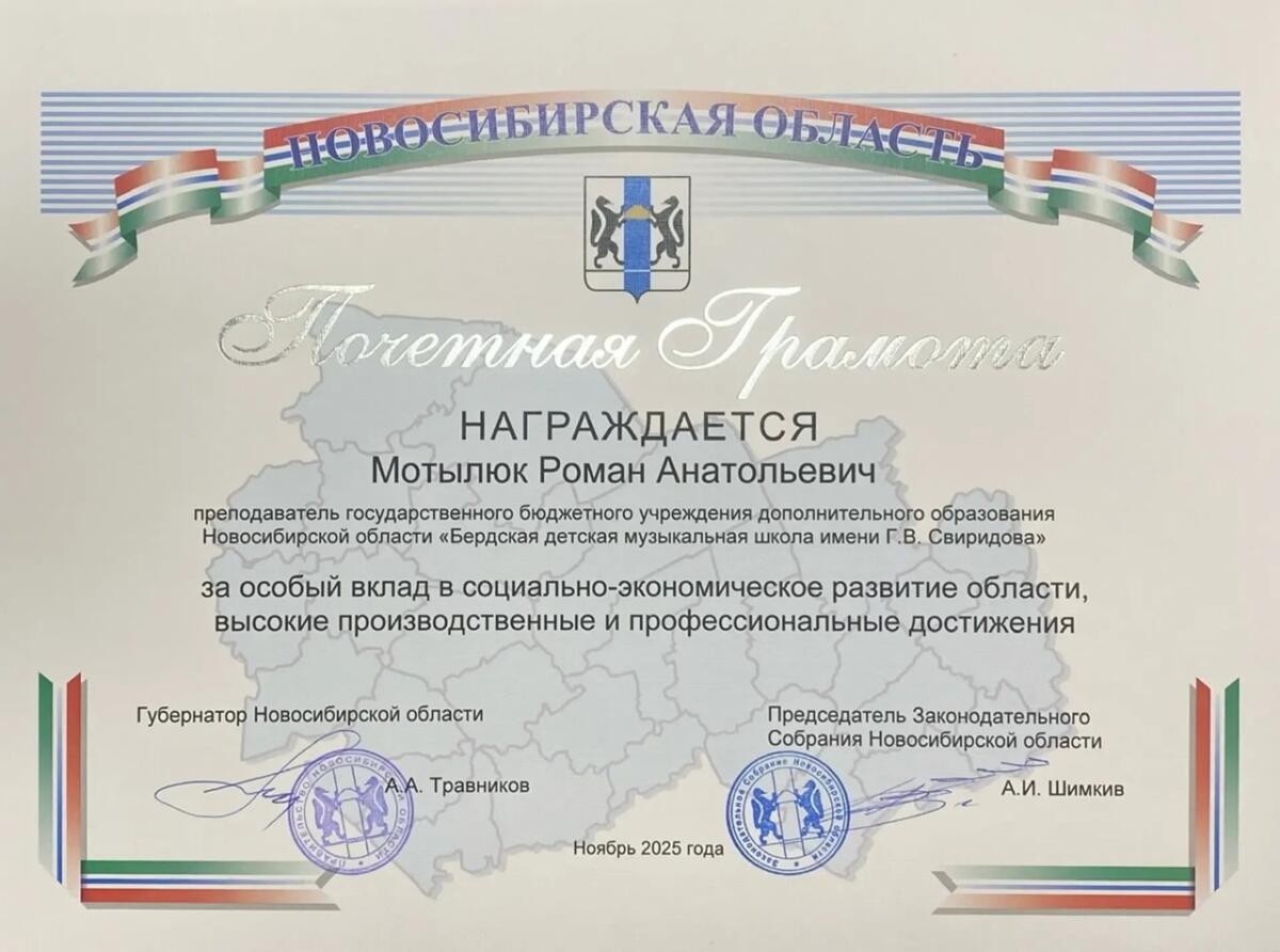 Среди награждённых бердчанин преподаватель и руководитель заслуженного коллектива народного творчества Новосибирской области музыкального театра «В главных ролях» Роман Мотылюк. Он получил почетную грамоту за особый вклад в социально-экономическое развитие области, высокие производственные и профессиональные достижения.