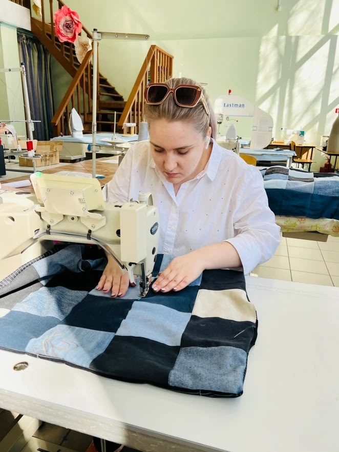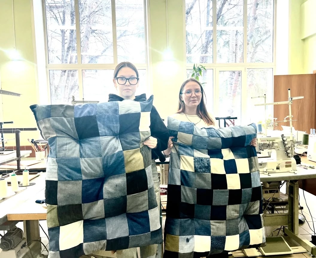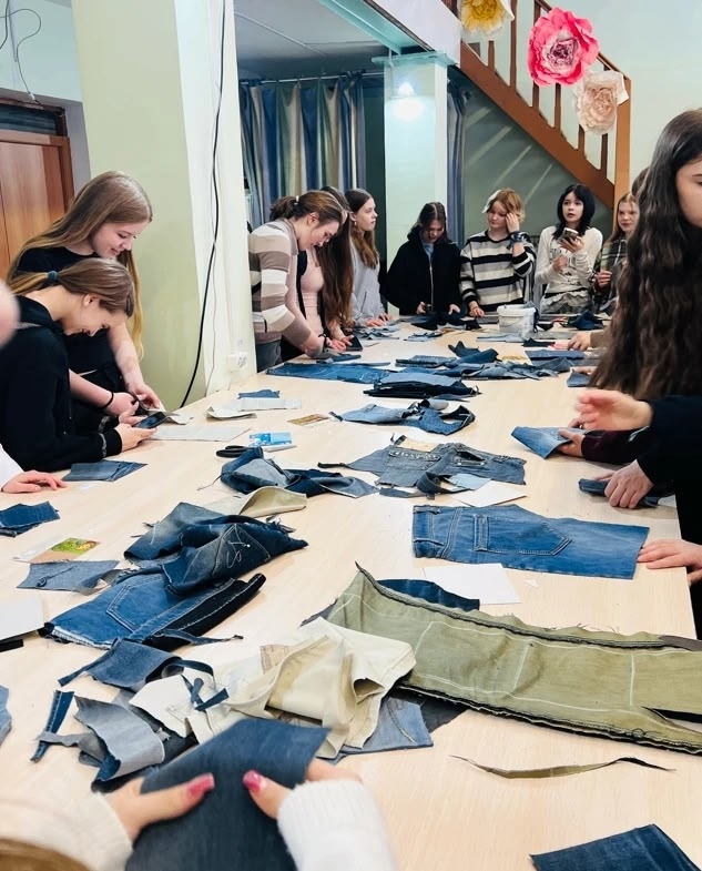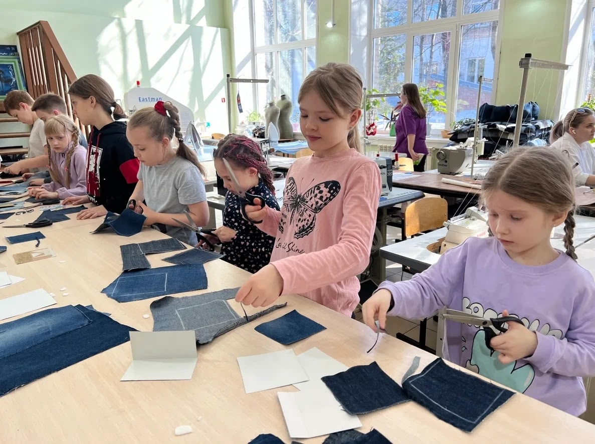 Ребята погрузились в процесс с головой: школьники познакомились с учебным цехом и учились кроить деним на квадраты, а студенты аккуратно сшивали заготовки в готовые изделия.