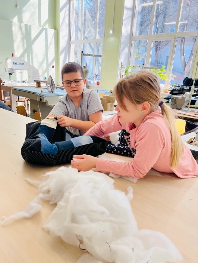А после к работе присоединились младшие школьники, они увлеченно кроили материал, пробовали шить и набивать подушки.