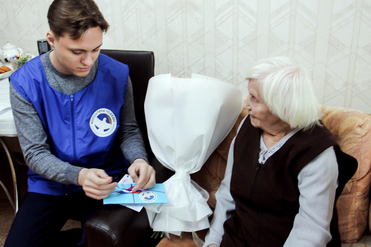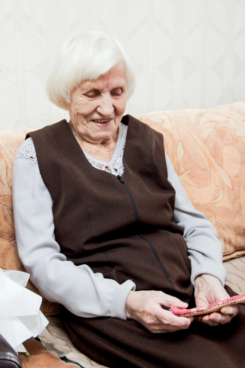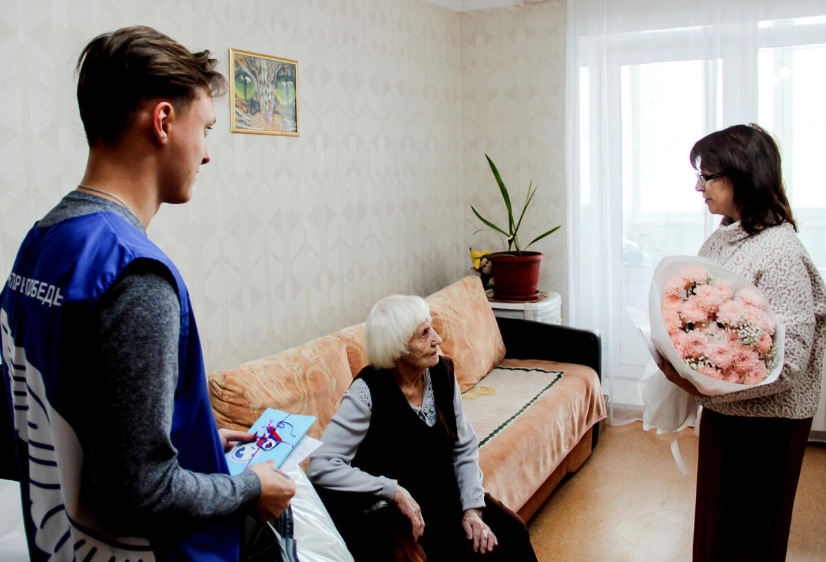 Анна Ивановна Пресная принимает поздравления с сотым днём рождения в Бердске. К юбиляру с памятным подарком и букетом цветов приехали представители администрации.