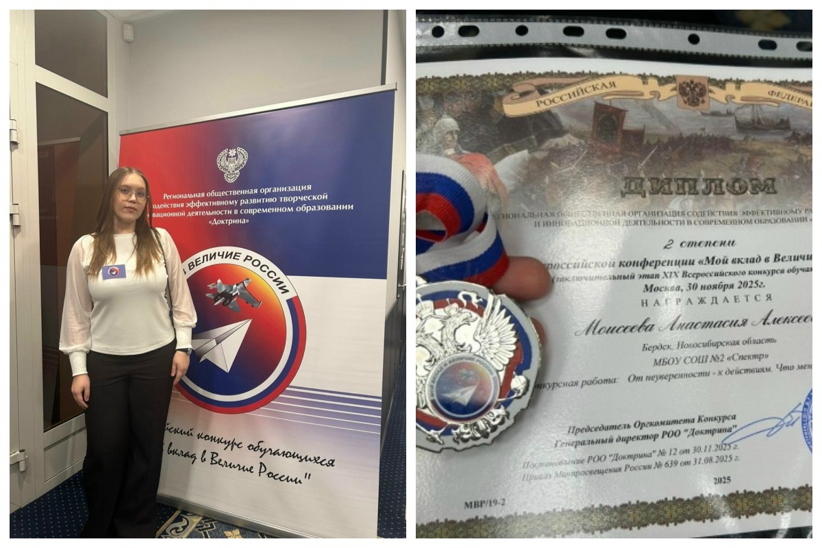 Ученица бердской школы добилась высокого признания на всероссийском уровне. Анастасия Моисеева, обучающаяся МБОУ СОШ № 2 «Спектр», завоевала Диплом II степени на заключительном этапе XIX Всероссийского конкурса обучающихся «Мой вклад в Величие России».