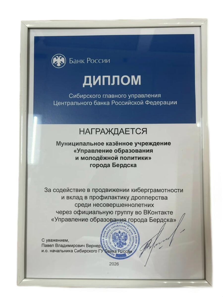 Управление образования Бердска отмечено дипломом Банка России за вклад в кибербезопасность детей