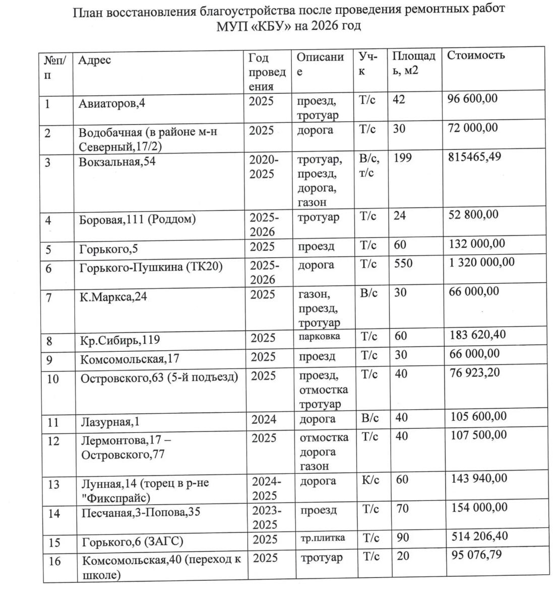 План работ по благоустройству разрытых ранее участков на 2026 год сообщил КБУ Бердска.