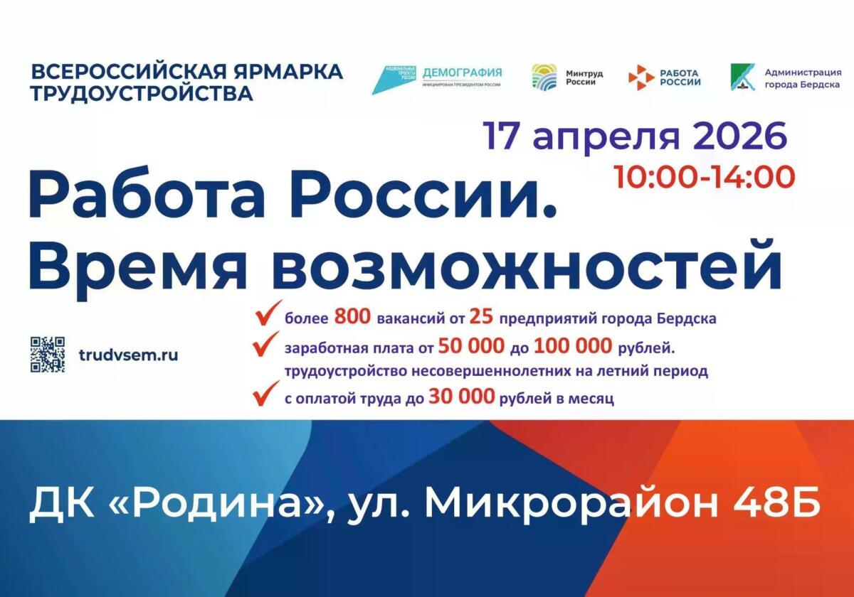 Бердский центр занятости населения приглашает жителей города на главное кадровое событие весны — Всероссийскую ярмарку трудоустройства «Работа России. Время возможностей».