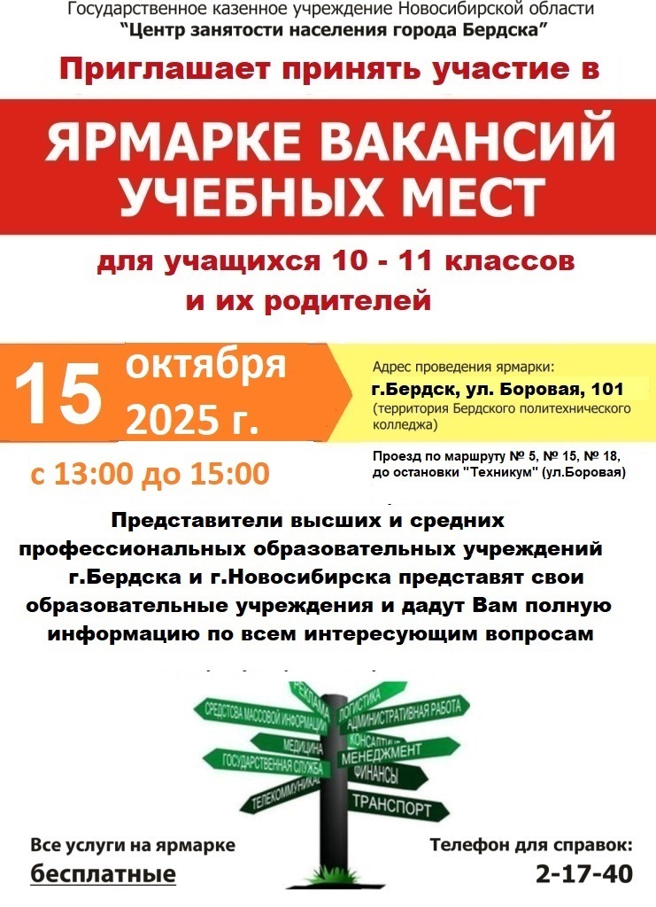 15 октября с 13:00 до 15:00 на базе Бердского полиехнического колледжа (г. Бердск, Боровая, 101) пройдёт ярмарка вакансий учебных мест.
