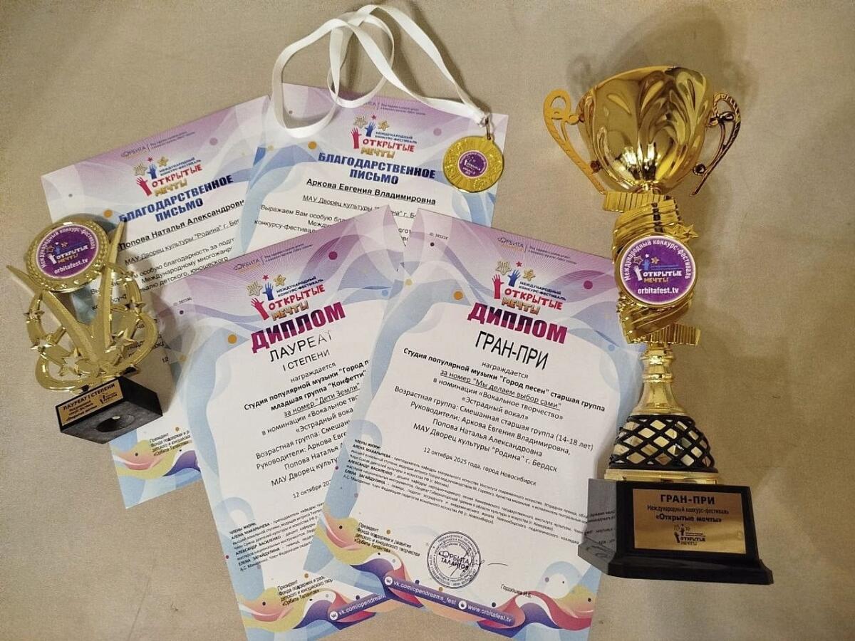 12 октября в Новосибирске в КДЦ им. К.С. Станиславского состоялся Международный конкурс-фестиваль «Открытые мечты». В номинации «эстрадный вокал» участие принял образцовый коллектив студия популярной музыки «Город песен» ДК «Родина» (руководители Евгения Владимировна Аркова и Наталья Александровна Попова).