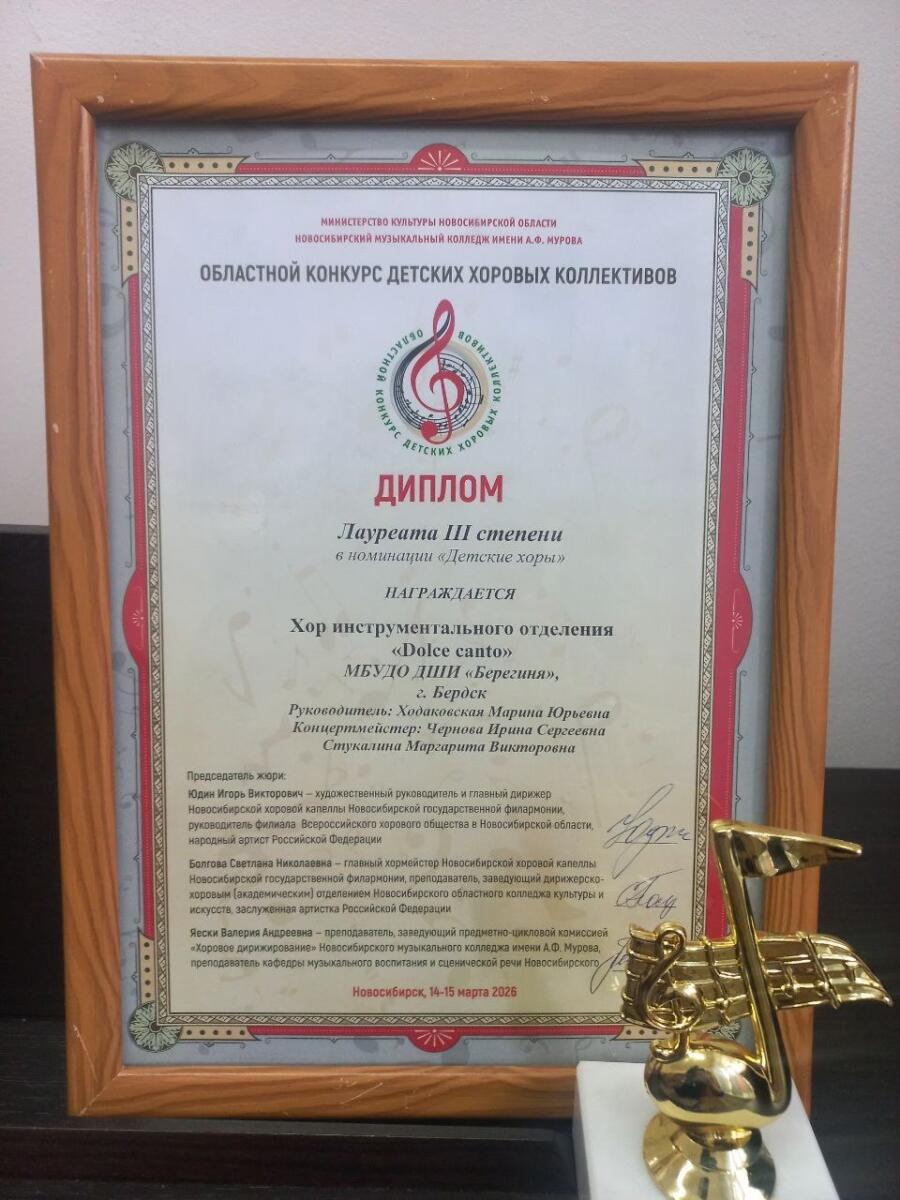 Хор инструментального отделения «Dolce canto» ДШИ «Берегиня» (руководитель Ходаковская Марина Юрьевна, концертмейстеры Чернова Ирина Сергеевна, Стукалина Маргарита Викторовна) завоевал диплом лауреата 3 степени.