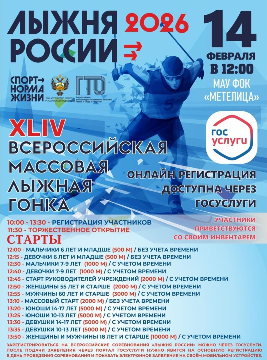 14 февраля Бердск примет участие во Всероссийской массовой гонке «Лыжня России». Это гонка для всех, независимо от возраста и уровня подготовки. Массовое мероприятие обещает стать ярким событием зимнего сезона. Соревнования в Бердске пройдут на лыжной базе «Метелица».