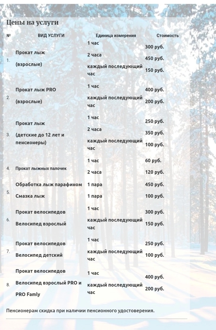 Цены проката лыж: 1 час — 300 рублей, 2 часа — 450 рублей, каждый последующий час 150 рублей. Для пенсионеров предусмотрены скидки.