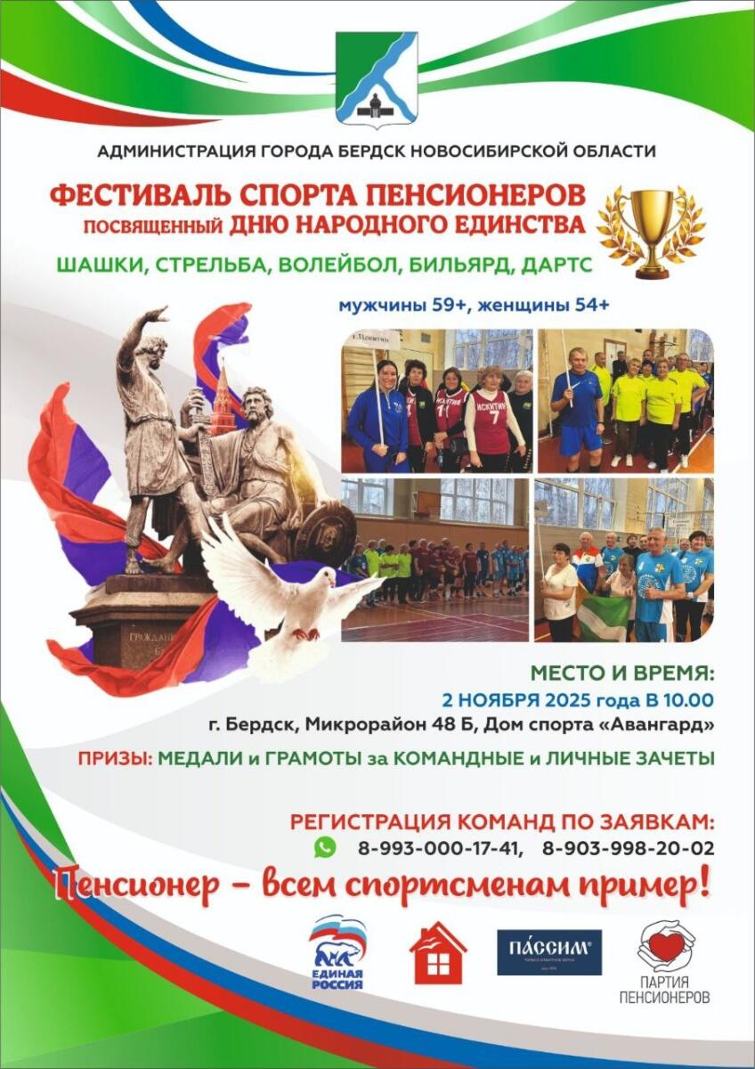 Фестиваль спорта пенсионеров, посвящённый Дню народного единства, состоится в Бердске 2 ноября в 10:00 в ДС «Авангард». В программе: шашки, стрельба, волейбол, бильярд, дартс.
