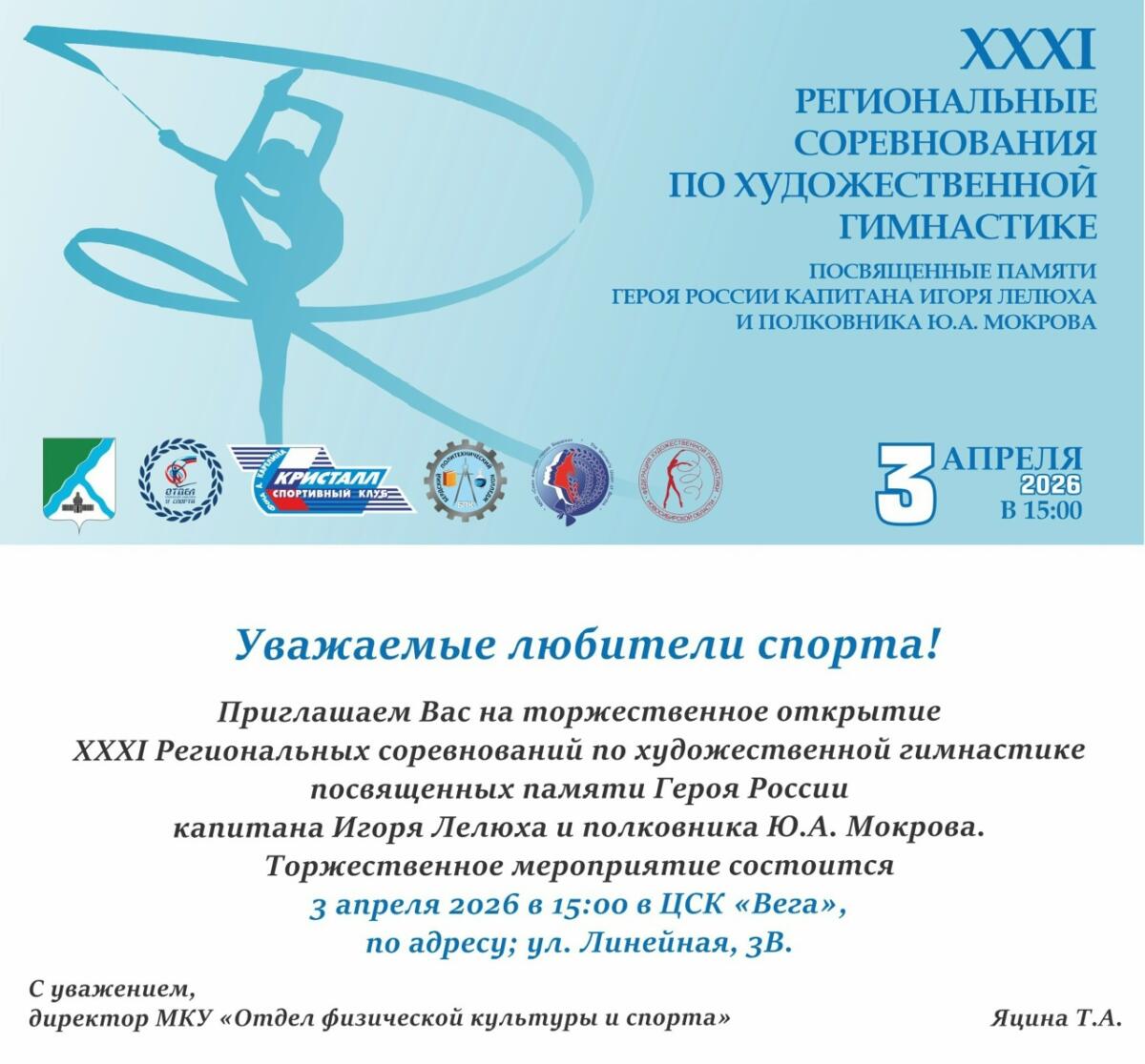 В Бердске пройдут XXXI региональные соревнования по художественной гимнастике, посвящённые памяти Героя России капитана Игоря Лелюха и полковника Ю. А. Мокрова. Об этом сообщили в ОФКиС.